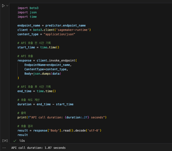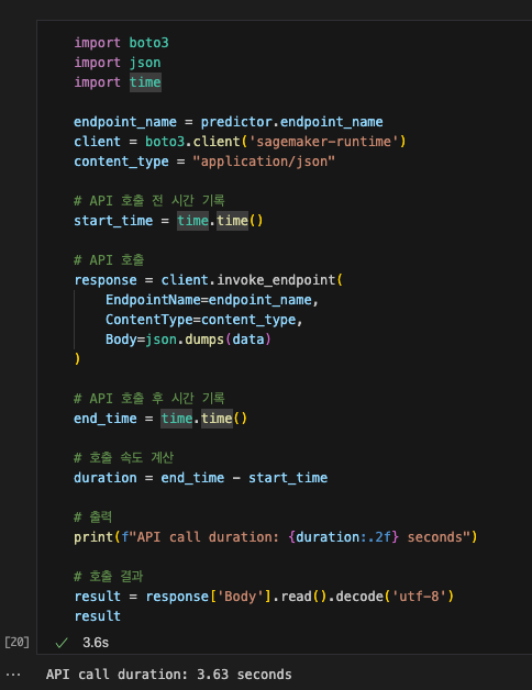 serverless를 진행하였을 때, API call duration이 3.63초가 나왔습니다. 약 3배정도 느린 것을 확인할 수 있습니다.
